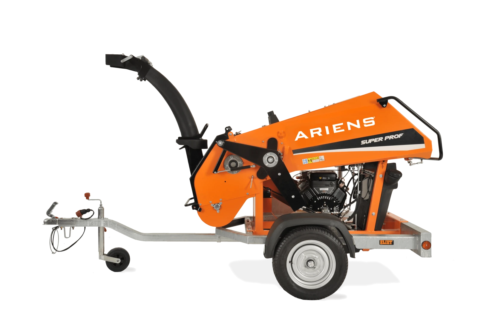 Kraftfull släpmonterad flishugg med anti-blockeringssystem som klarar grenar ända upp till 13 cm diameter.